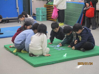 1・2年生は秋川カルタ会の方をお招きして百人一首に挑戦しました。1、2年生は3学期に入ってから百人一首に取り組んでいたため、上の句を読んでいる途中に下の句を取れる子もいて、講師の方もびっくりされていました。