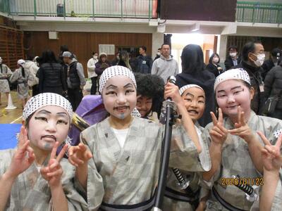 4年生は菅生歌舞伎一座のみなさまに協力いただき、歌舞伎体験をしていました。