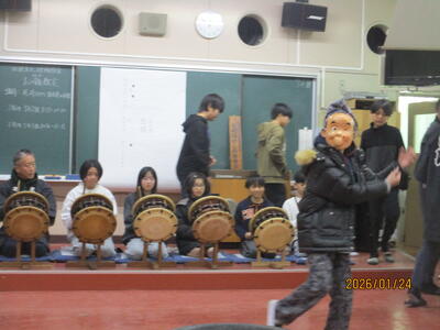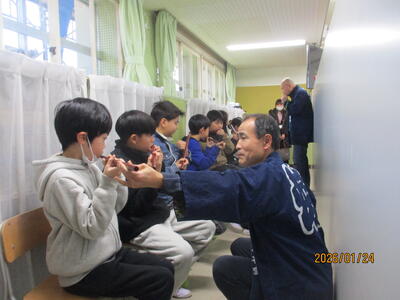 5年生は、尾崎はやし保存会の皆様にお囃子について教えていただきました。お囃子を途切れさせることなく続けることが肝要だと教わり、45分間、目いっぱい体験することができました。はじめは揃わなかったリズムもずいぶん調子よく揃いだした頃には、ひょっとこやおかめも踊りだし、楽しい祭りの情景が浮かびました。