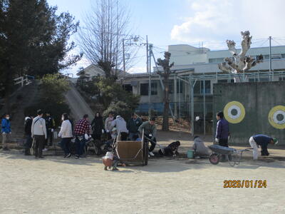 午後には、PTAと青少健と学校運絵協議会の共催で校庭の側溝清掃を行いました。参加者には保護者の皆様が朝早くから準備してくださったカレーが振る舞われました。おいしかったので、何杯もおかわりする子がいたようです。とても寒い日でしたが汗をかきながら校庭の側溝にたまった土を掻き出し、運んでくださった皆様、本当にありがとうございました!