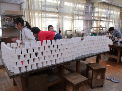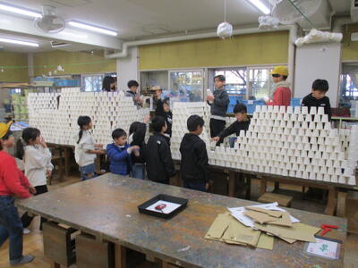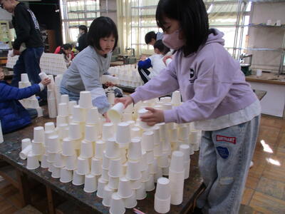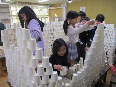 図工で造形遊び 投稿: 校長 (16:34) カテゴリー: 連絡事項 図工室をのぞいてみると、2年生の子供たちが楽しそうに活動しています。 紙コップを高く積み上げたり、横に広げたり思い思いに作っています。 図工の杉渕教諭に聞いてみますと、「造形遊び」だそうです。 学習なのに遊び? 「身近にある紙コップを使って紙コップランドをクラスのみんなで作る造形遊びです。 限りがある素材を分け合う難しさに挑戦しました。」とのこと。 みんな夢中です。 図工に苦手意識がある私としては、「小学校時代にこんな学習があったら、図工好きになってたなあ。」 と思うのでした。